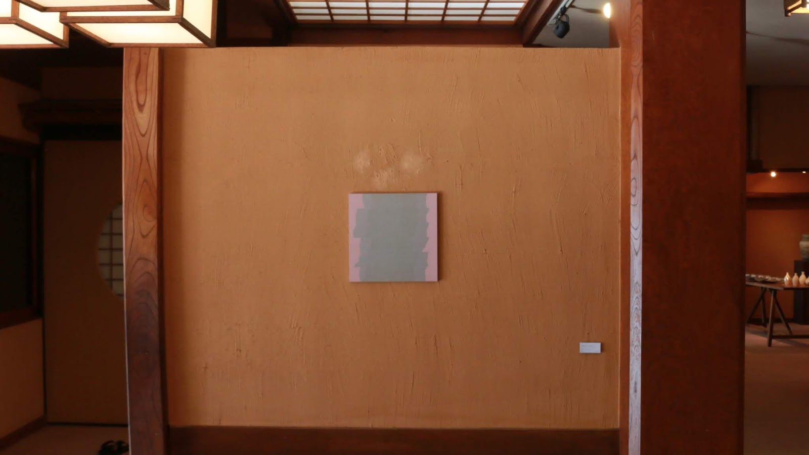 窓などに使われる文明的な素材としてのガラスを用いたこの作品は大黒屋の特徴的な黄土の壁を見せるために作ったとのこと、作品を観て外の庭(自然)へ意識を流す役目があるそうです。文明的なガラスを意図的に割ることで自然のコントロールできない現象を起こして文明の領域にあるガラスを自然の領域へ移したといいます。ガラスの割れ目に貼られているテープをよく見ると真っ直ぐな部分(目的に見合った合理的要素)とビリビリに破れている部分(目的を無くした野生的要素)があります。